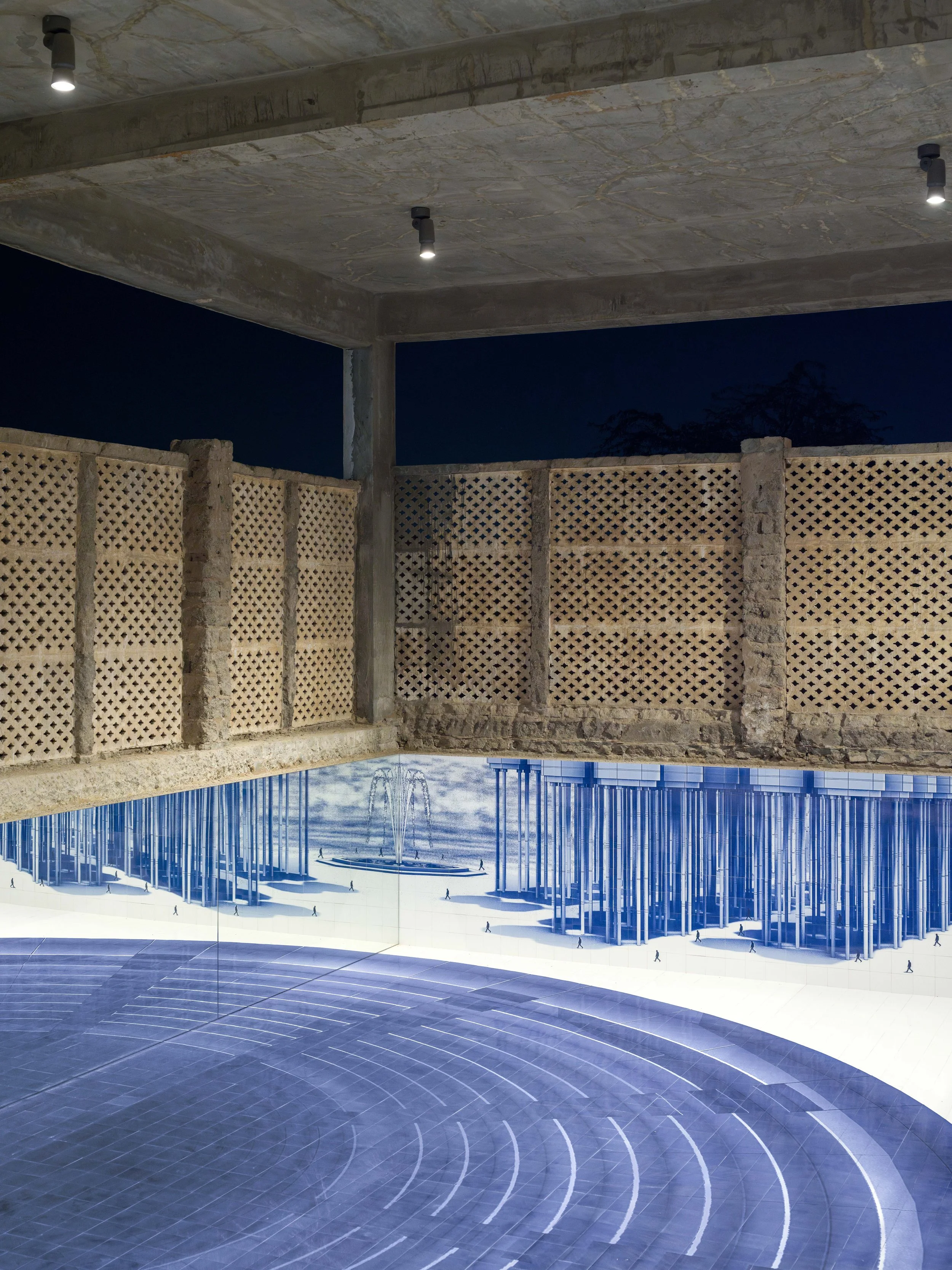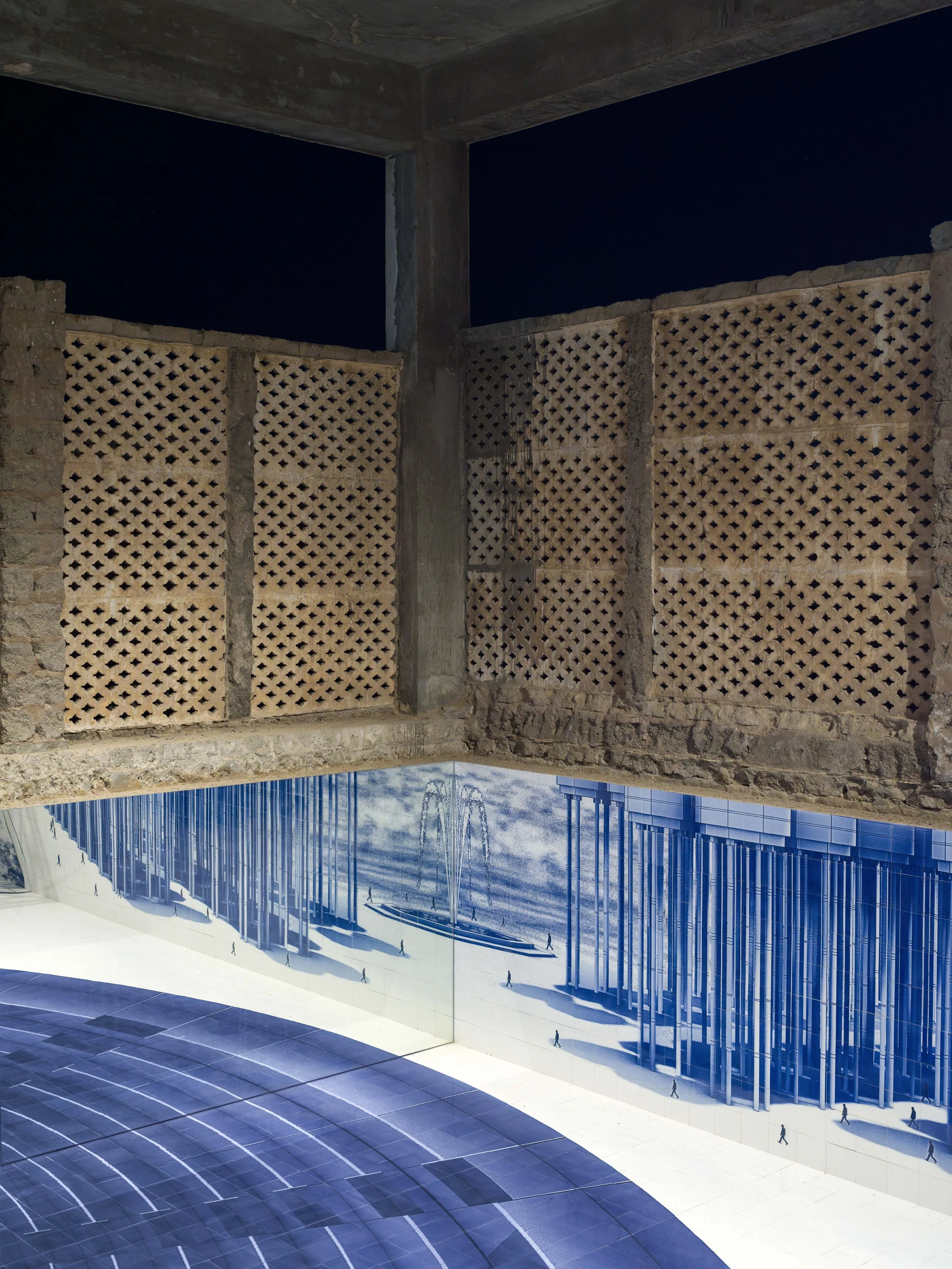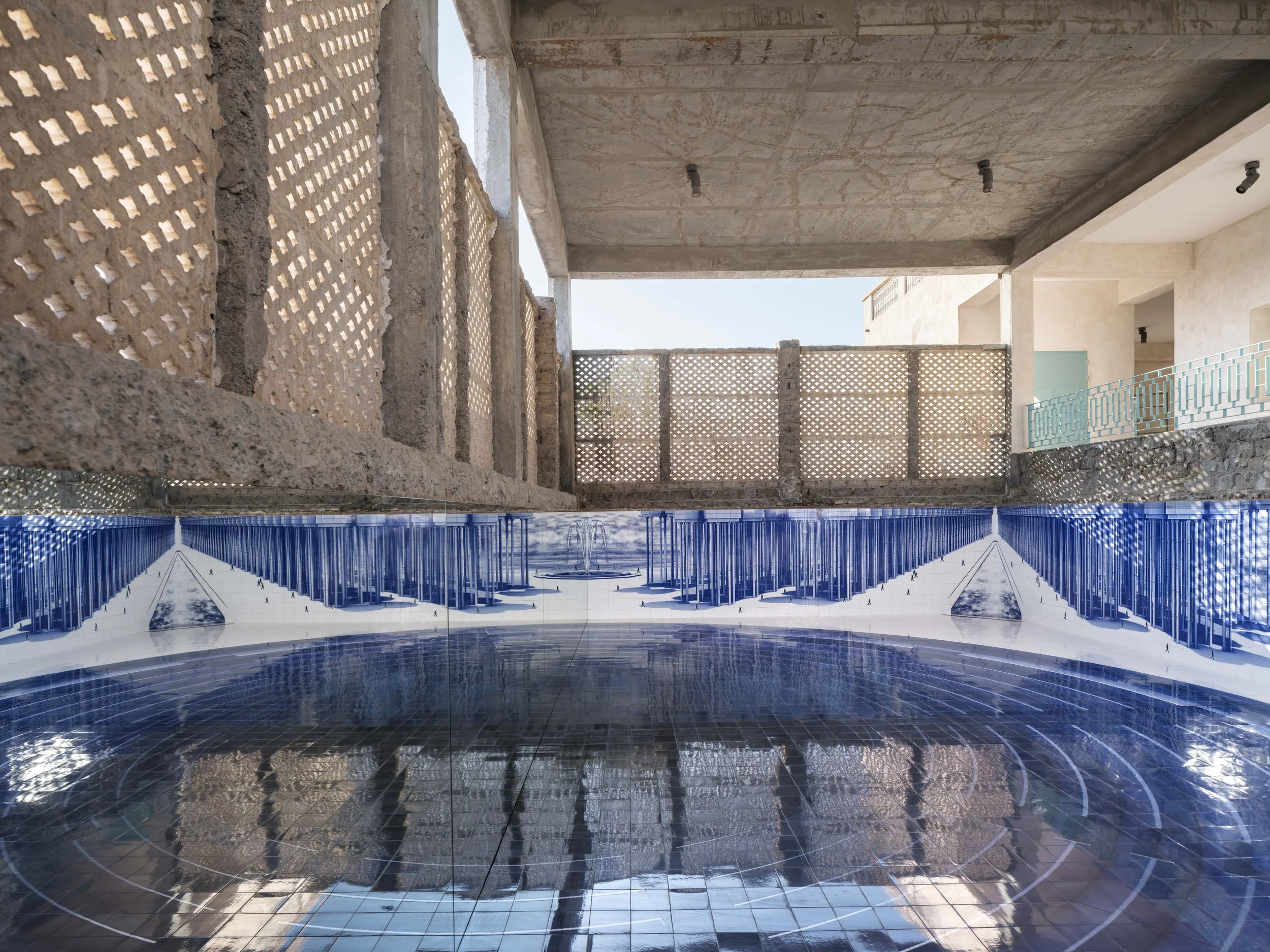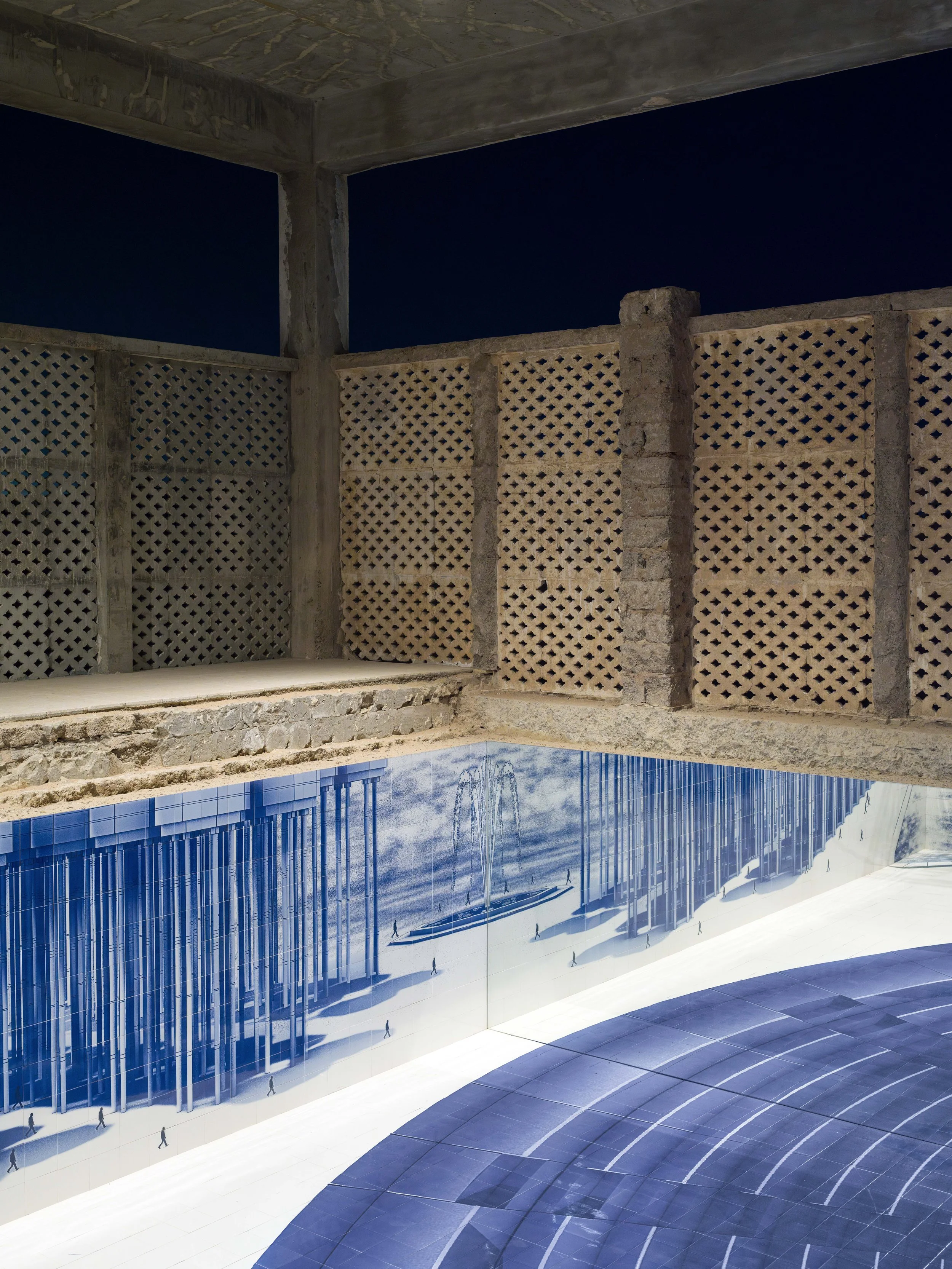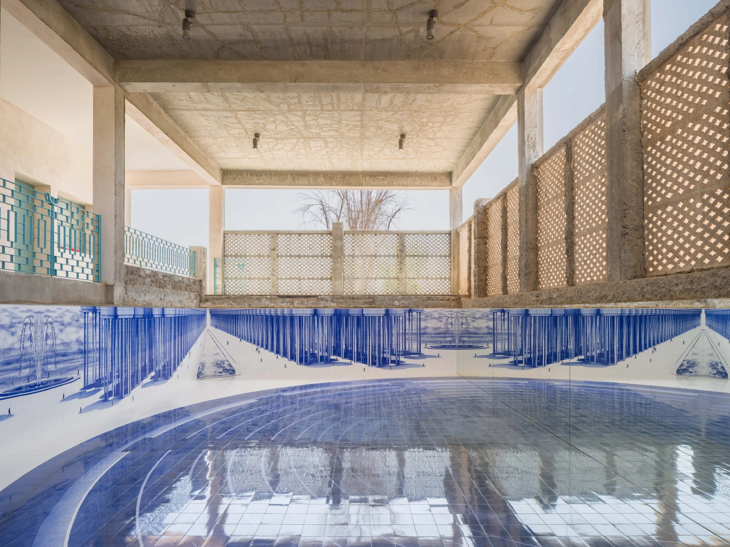 Taken the form of large architectural interventions and staged environments. Reflecting on the wave of construction of mega national projects in the region, the work commissioned for Sharjah Biennial 16 departs from an ‘empty pool’ as an architectural site of malfunction and failure, transforming it into a stage for an imagined living future. Pool of Perspectives - 2030 (2025) is a tiled void with a classical ceramic mural in the style of futuristic CGI renders of unrealised structures, while referring to the legacy of Portuguese colonial history in Sharjah. The work uses optical illusion techniques borrowed from classical Portuguese Azulejo tiles—an established art-historical form for creating a permanent image to commemorate epic moments from the past.