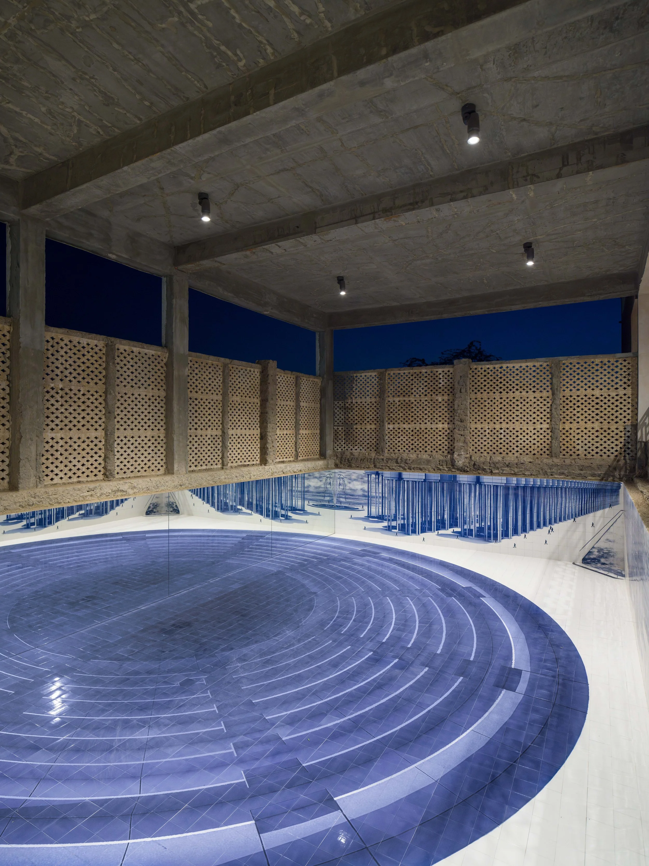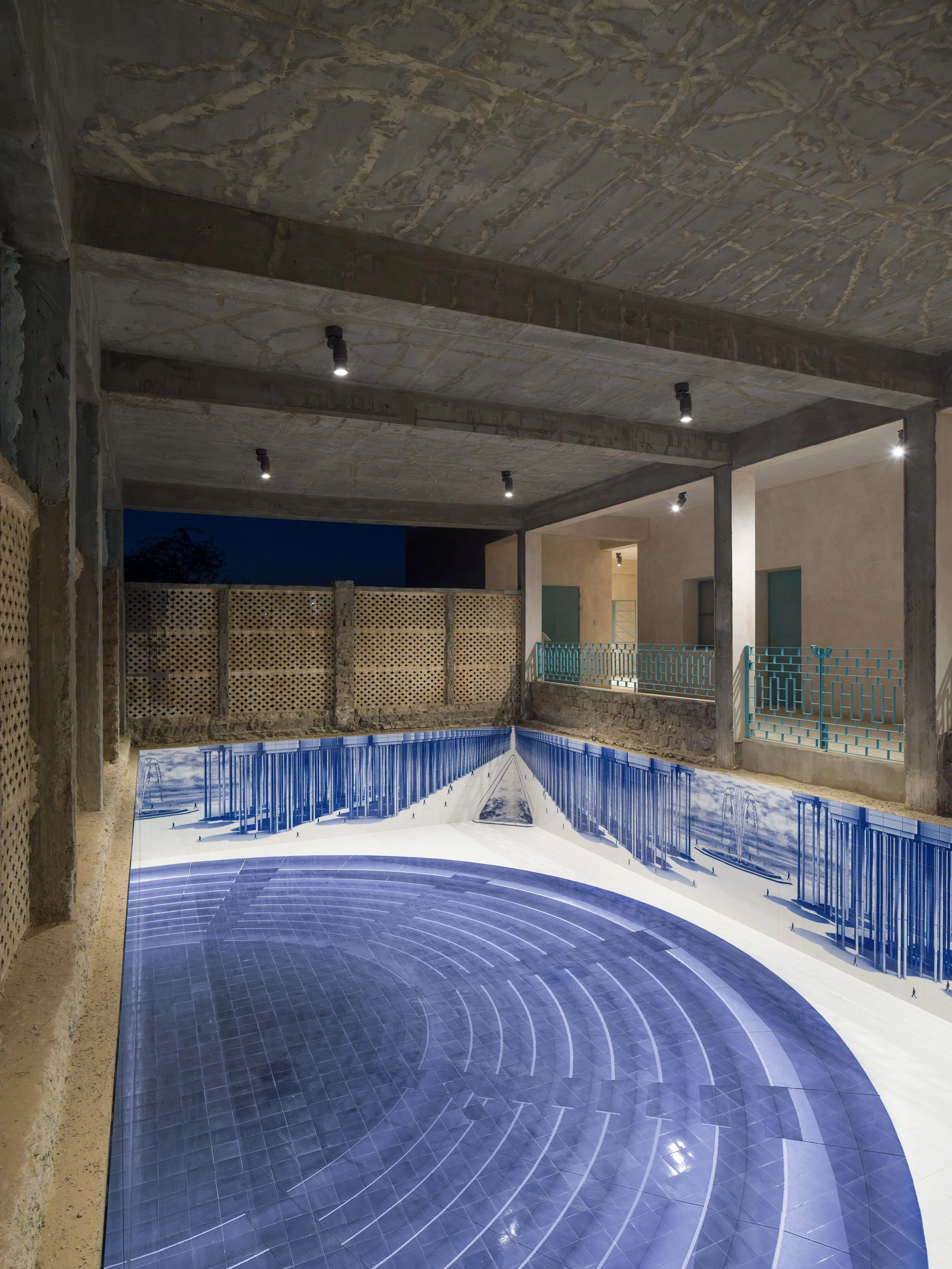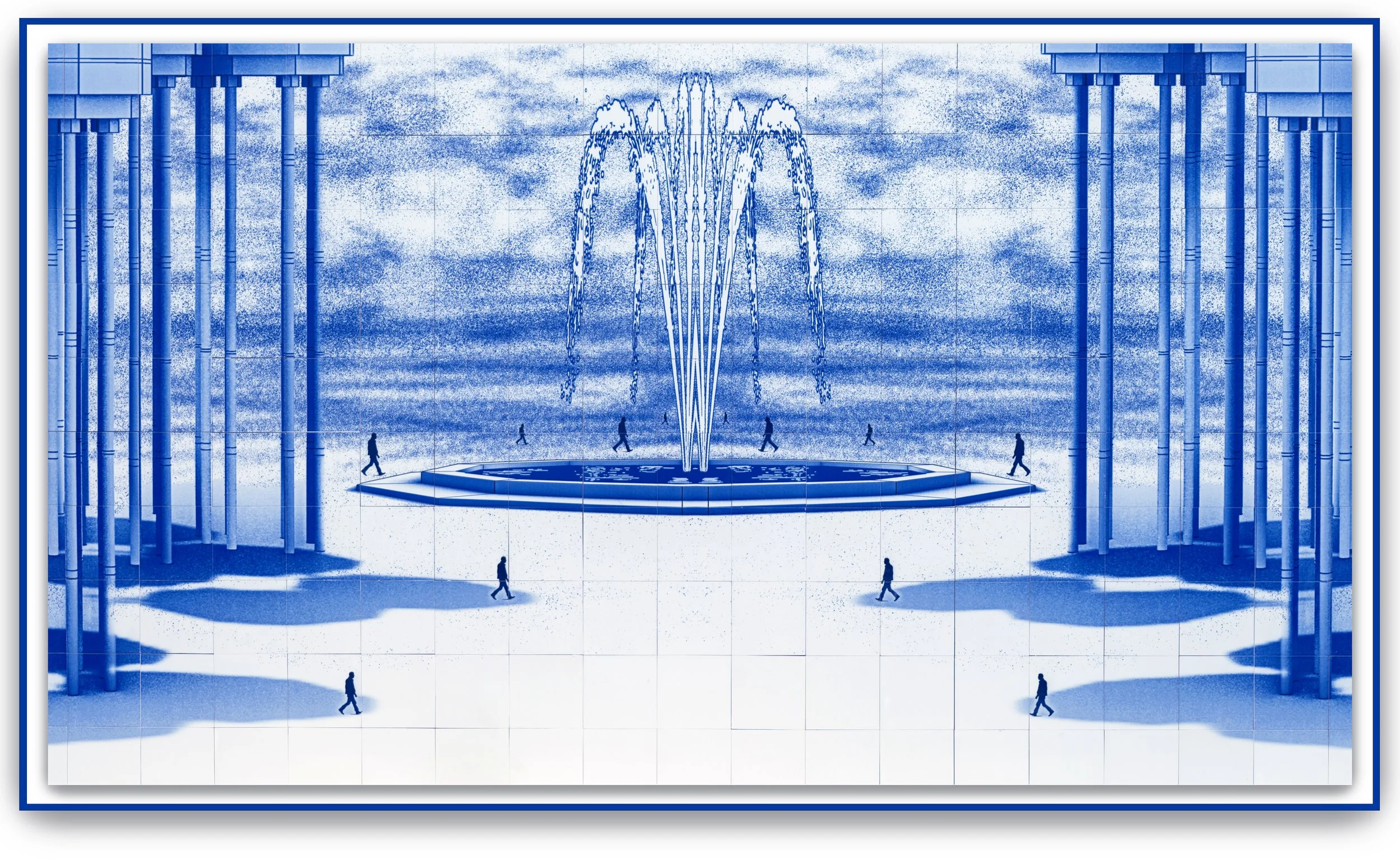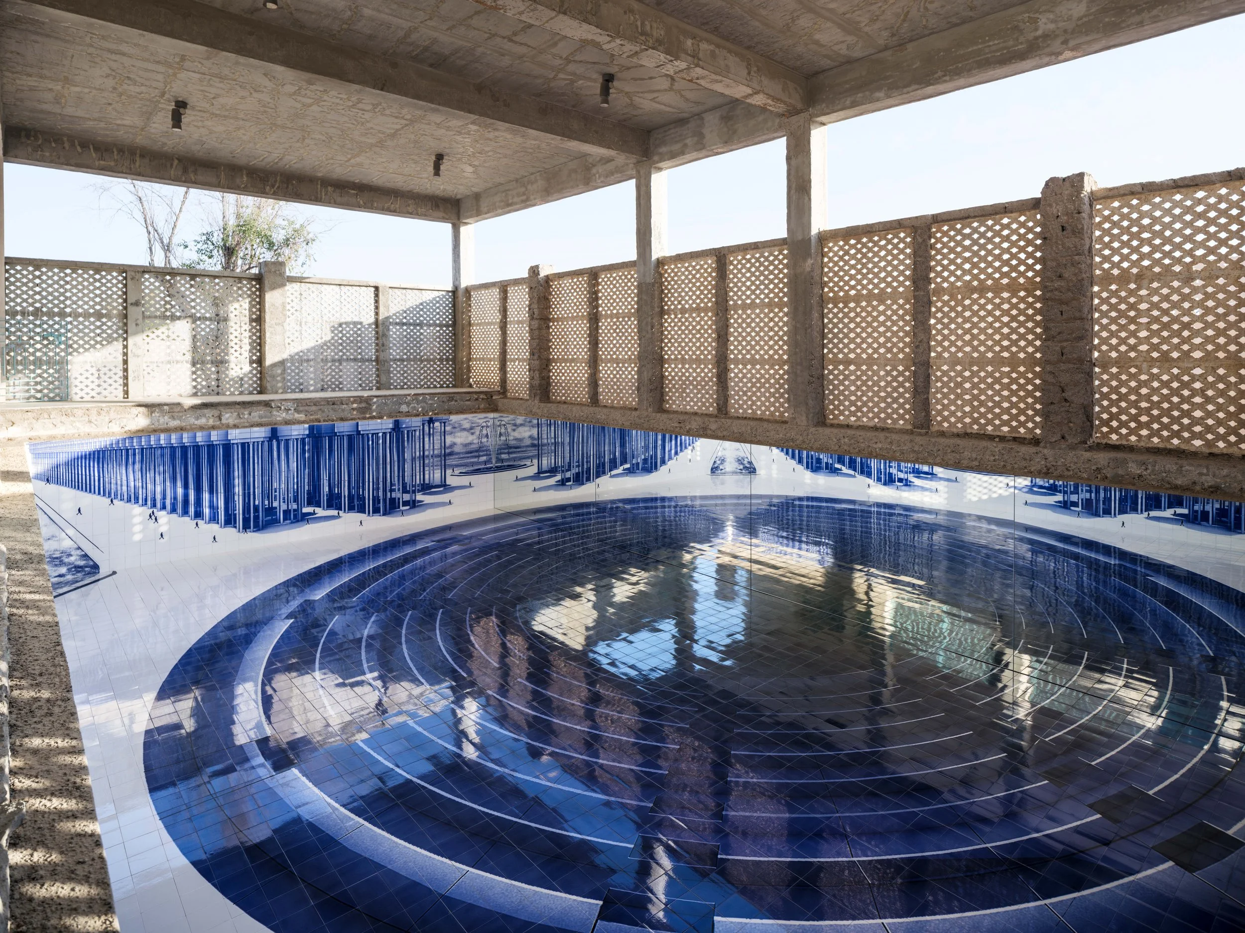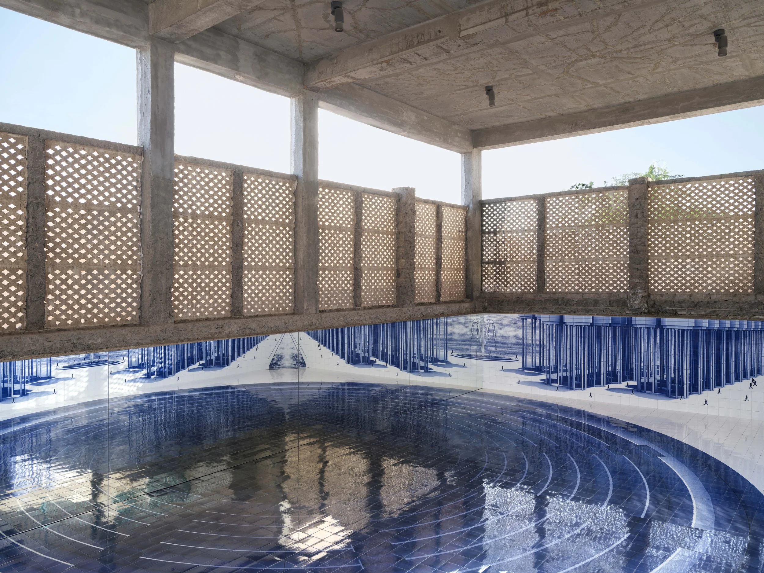 Taken the form of large architectural interventions and staged environments. Reflecting on the wave of construction of mega national projects in the region, the work commissioned for Sharjah Biennial 16 departs from an ‘empty pool’ as an architectural site of malfunction and failure, transforming it into a stage for an imagined living future. Pool of Perspectives - 2030 (2025) is a tiled void with a classical ceramic mural in the style of futuristic CGI renders of unrealised structures, while referring to the legacy of Portuguese colonial history in Sharjah. The work uses optical illusion techniques borrowed from classical Portuguese Azulejo tiles—an established art-historical form for creating a permanent image to commemorate epic moments from the past.